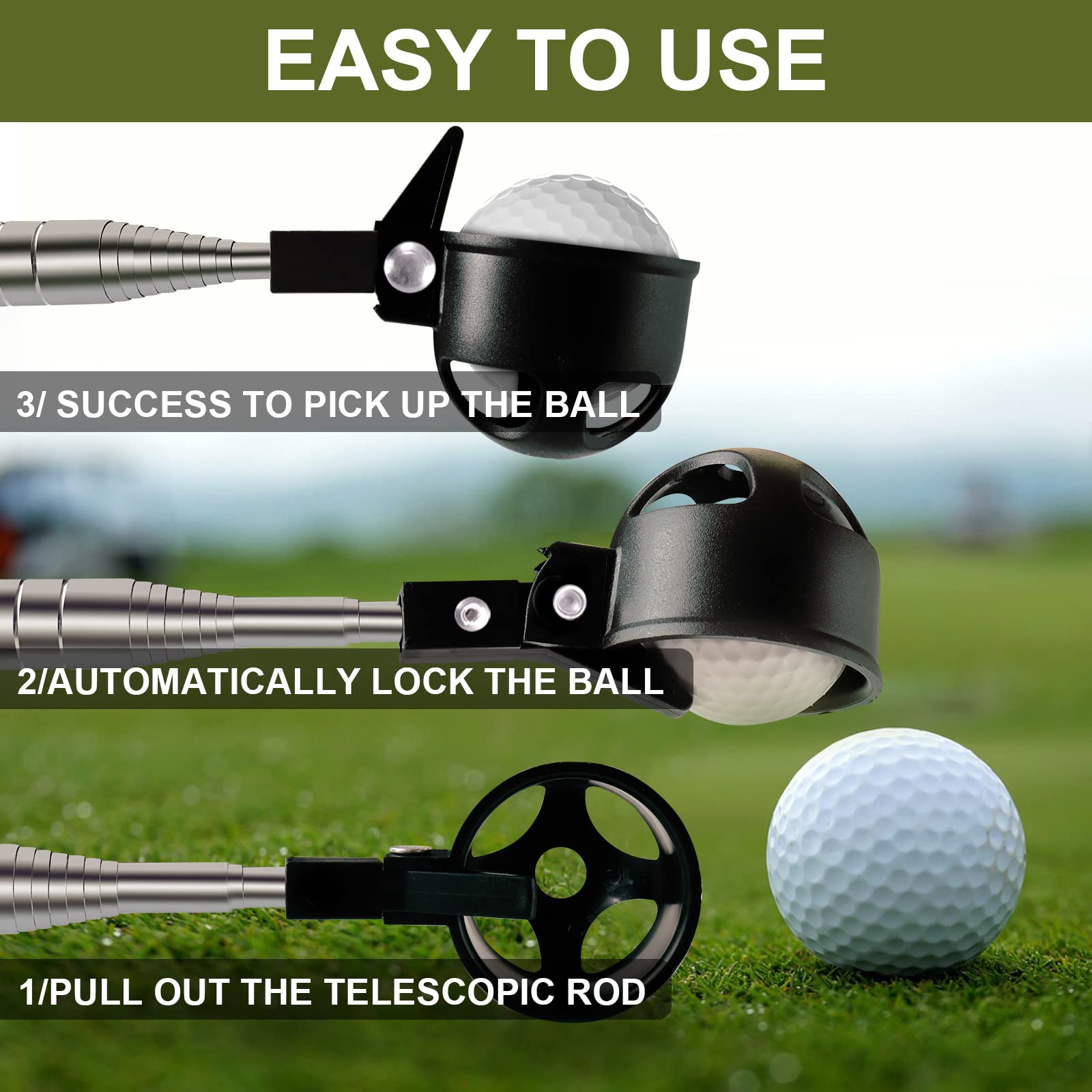 - 【Stainless Telescopic Golf Ball Retriever】 The retractable design allows you to pick up the ball without bending, which not only saves your energy and time, but also protects your waist. It can also help you easily retrieve your ball from ponds, mud, bushes and lake.