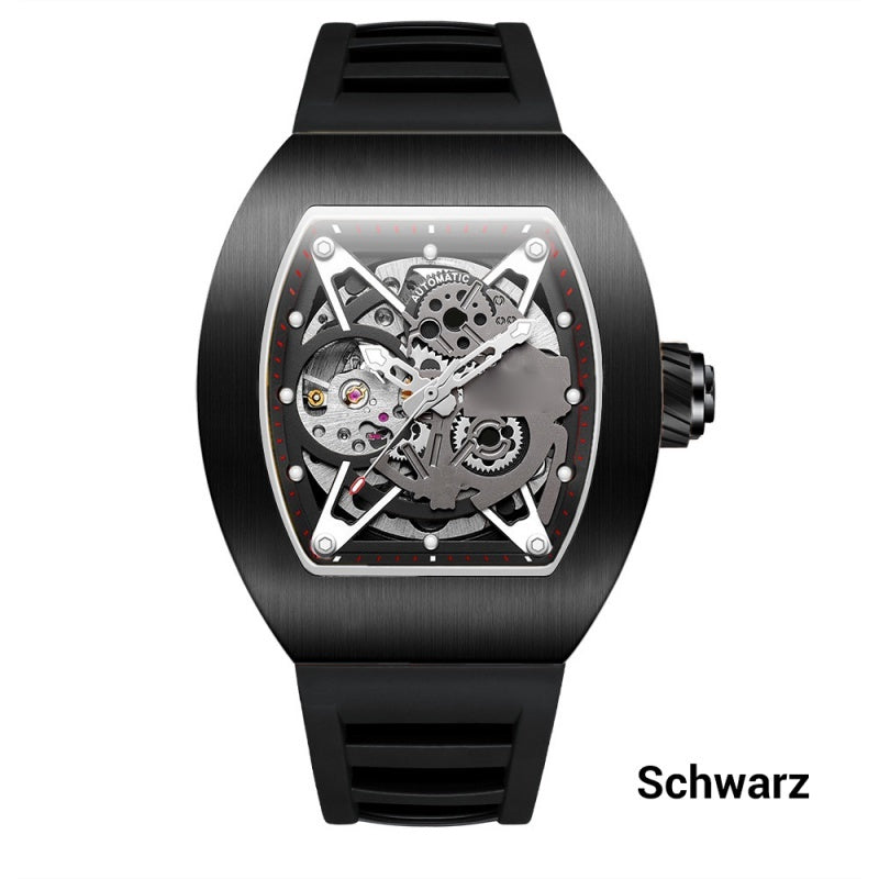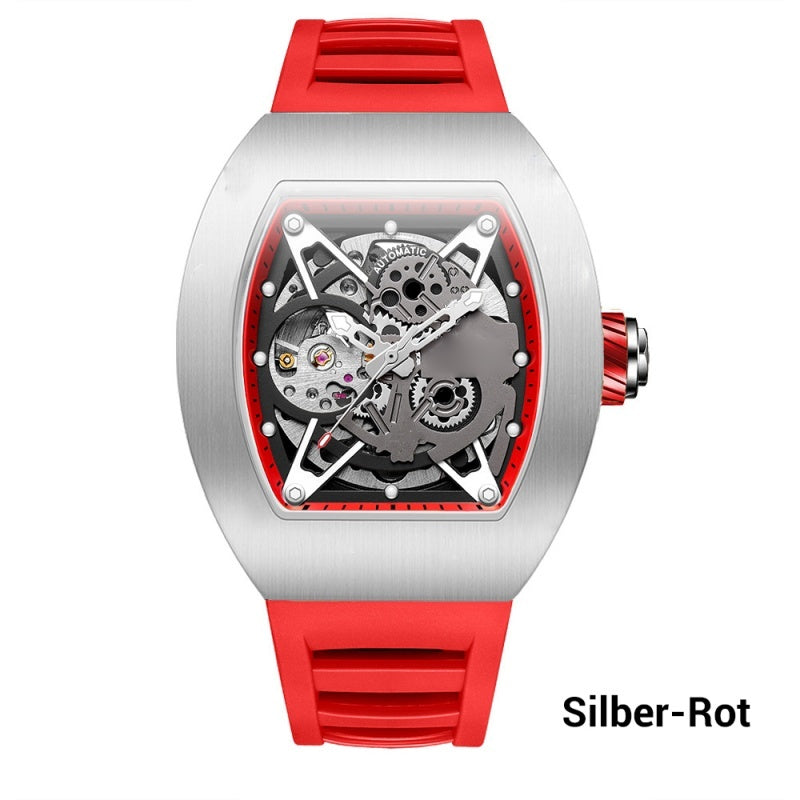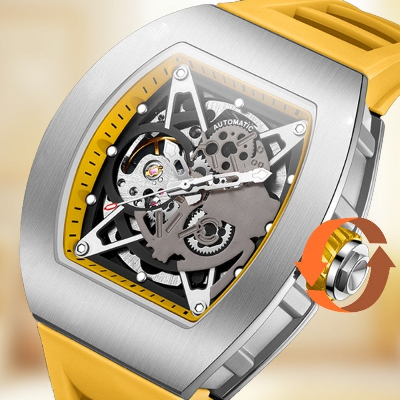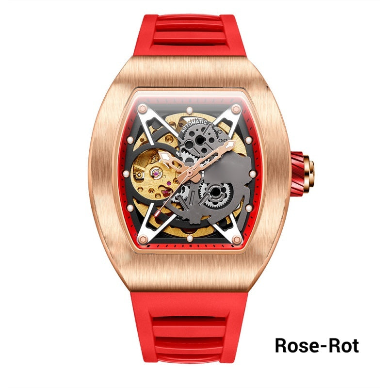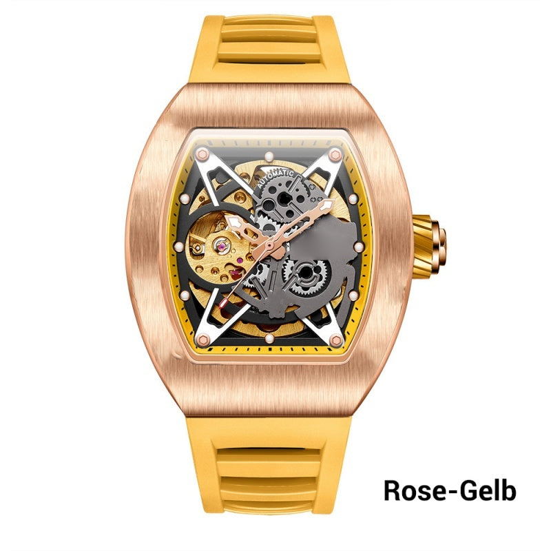 STYLISH DESIGN: The skeletonised design is modern and adds a touch of glamour to this automatic watch. Available in a variety of colours and with a unique barrel-shaped dial, this watch is guaranteed to turn heads and make a fashion statement.